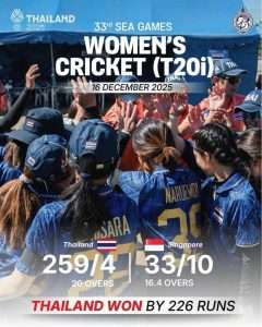 Day eight of SEA Games 2025 saw the continuation of the men’s T10 and women’s T20 which both started yesterday but it will always be remembered for the performance of Natthakan Chantam who rewrote the cricket record books as she hit 148^ from 69 balls and Thailand beat Singapore by 226 runs. SEA Games 2025 will now have a permanent place in cricket’s long history.