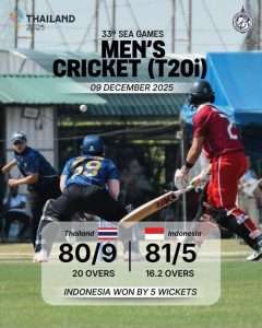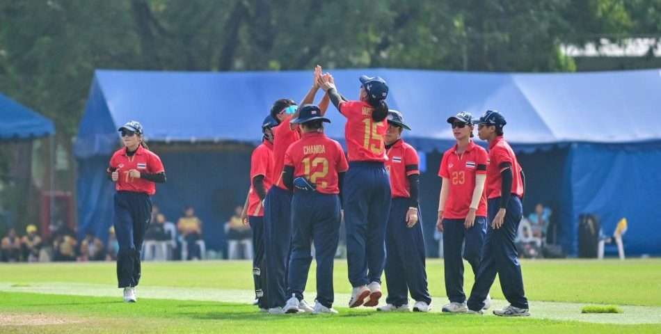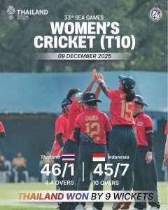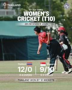 The SEA Games 2025 cricket event got underway and Thailand Women gained an emphatic win in their first match in the women’s T10 competition at AIT. It took less than hour for the Thai girls to bowl out Singapore for just 9 as Thipatcha Putthawong took four wickets and the openers needed four balls to claim a 10-wicket win.